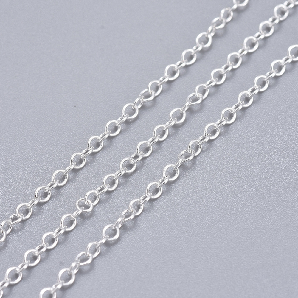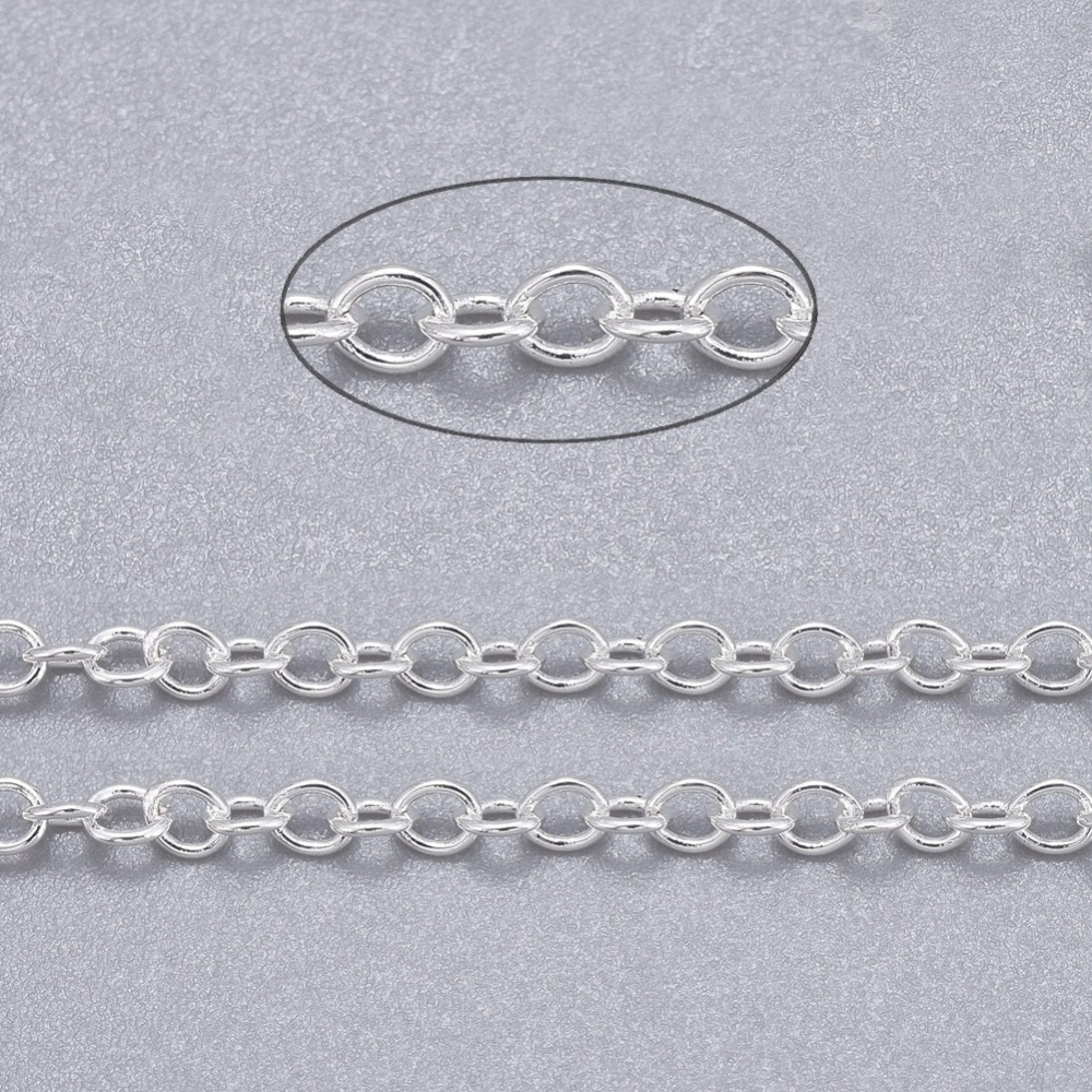 Acest lanț din alamă argintiu, fără nichel, este ideal pentru bijuterii handmade și proiecte DIY. Lanțul este format din zale fine de 2x1.5 mm, cu un aspect elegant și versatil, potrivit pentru coliere, brățări, cercei sau accesorii personalizate.