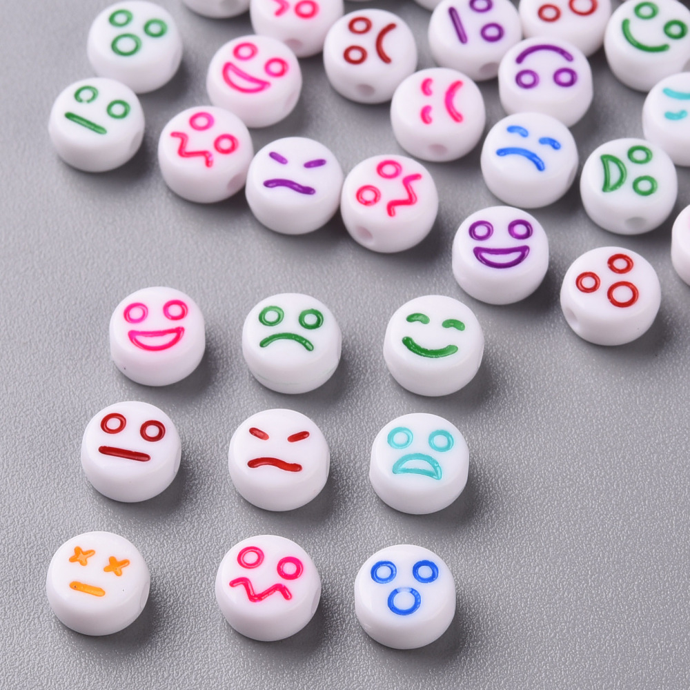 Margele acrilice cu emoticon cu diverse expresii (smiley, sad, angry) rotund plan 7x4 mm, gaura de 1.6 mm, 50 bucati multicolore