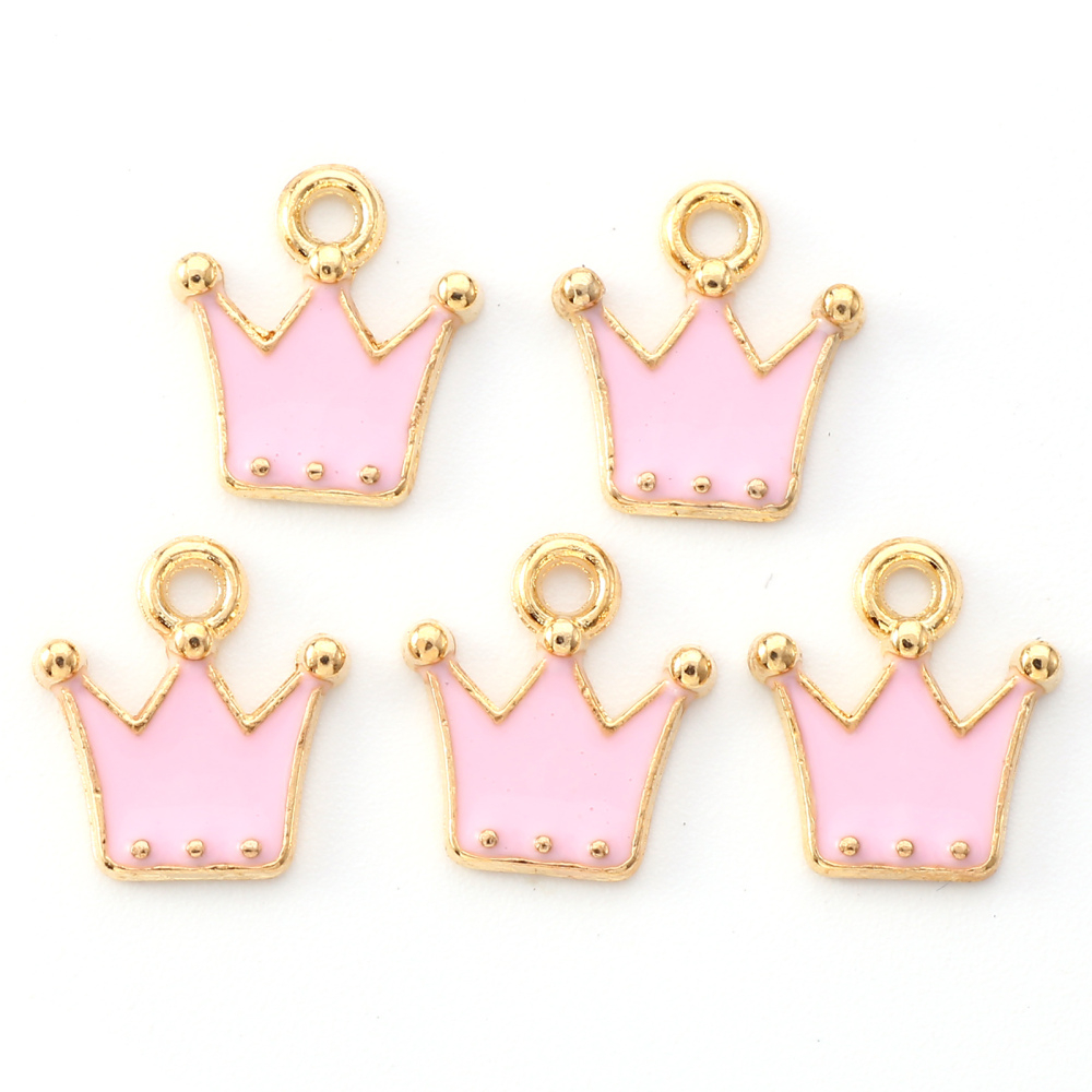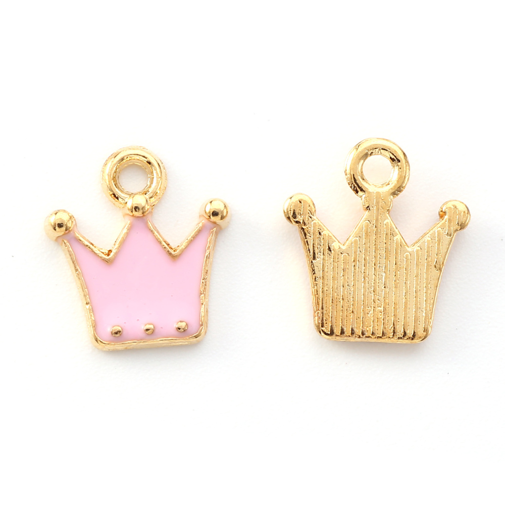 Charm emailat, coronita roz, din aliaj auriu.